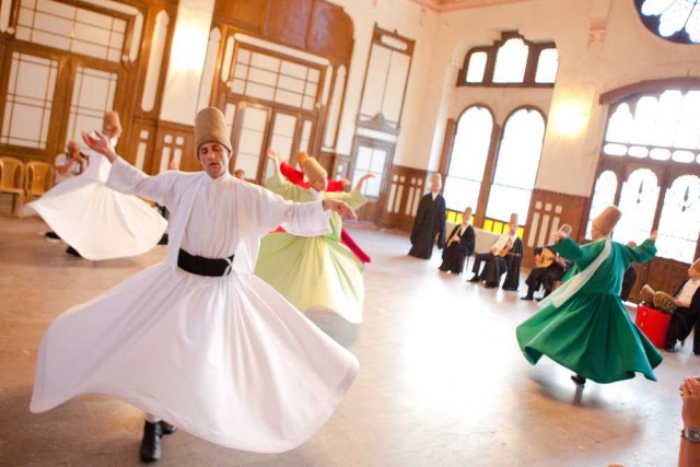حينها لم يتمالك الرومي نفسه، وإذ بجسده يتمايل يمينًا ويسارًا مع صوت المطارق، وبدأ في رفع يده اليمنى فيما عيناه مغمضتان، ورأسه مدلدل على كتفه الأيمن، فاستدار على حالته تلك مرتكزًا على رجله اليمنى، ثم شرع في الدوران، وفجأة رأه صاحب المحل الذي يطرق الذهب، وكان يسمى صلاح الدين زركوبي.