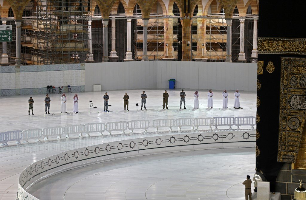 مسلمون يؤدون الصلاة مع الحفاظ على مسافة بينهم بجانب الكعبة في المسجد الحرام، مكة المكرمة في 27 نيسان/ أبريل.