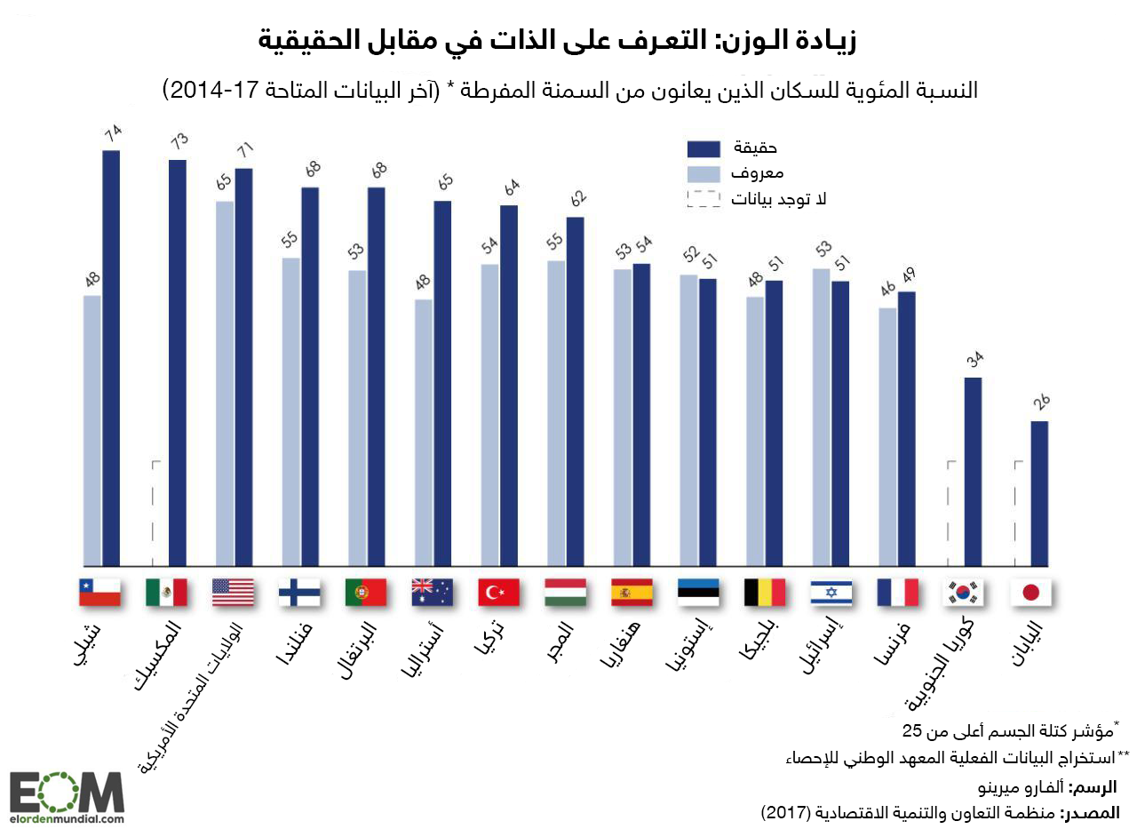 السكان الذين يعانون من زيادة الوزن المعترف بها ذاتيًا في بلدان مختلفة من العالم. يلعب الاستهلاك المفرط للسكر دورًا حاسمًا في زيادة الوزن.