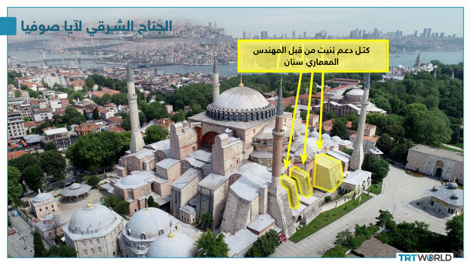 وفي حواره مع تي آر تي وورلد، أضاف المؤرخ التركي قائلا: “بُنيت بعض هذه الدعامات في العصر البيزنطي. لكن المعروف أن قبة آيا صوفيا شكّلت ضغطًا كبيرا على بقية المبنى، لذلك وضع سنان دعامات حجرية لتخفيف الضغط”.