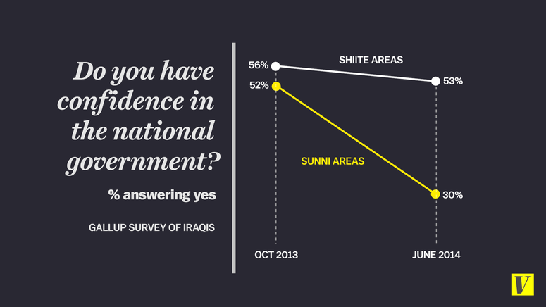 هذه الصورة توضح فقدان السنة العراقيين الثقة في حكومتهم بين أكتوبر 2013 ويونيو 2014