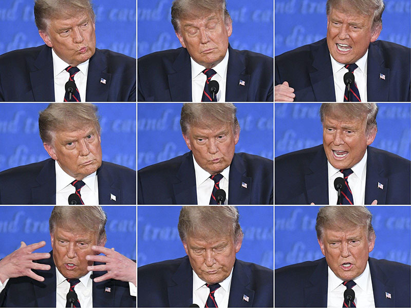 مجموعة من الصور تظهر رئيس الولايات المتحدة دونالد ترامب خلال المناظرة الرئاسية الأولى مع المرشح الديمقراطي للرئاسة، جو بايدن، في جامعة كيس ويسترن ريزيرف وكليفلاند كلينيك في كليفلاند، أوهايو في 29 أيلول/ سبتمبر 2020.