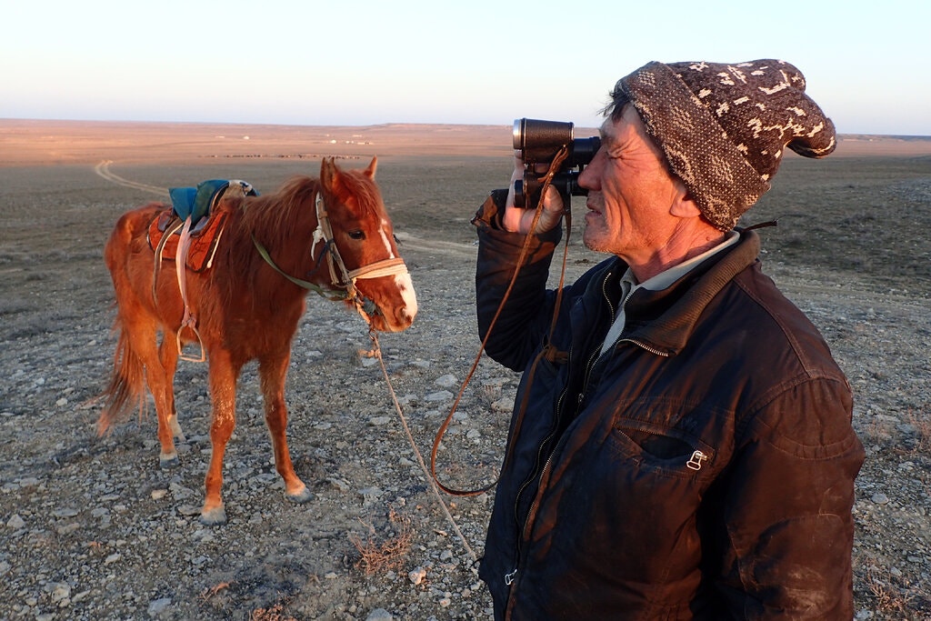 راعي يراقب السهوب بحثا عن قطعان ماشيته في غرب كازاخستان.