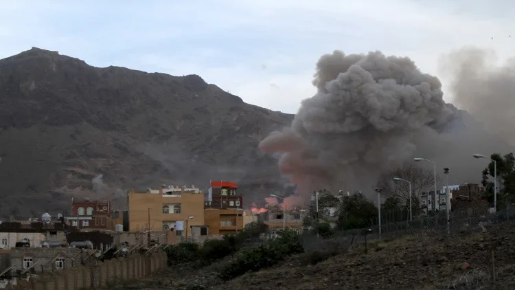 طفل صغير يلعب حول سيارة محترقة في عدن عام 2018، كانت المنطقة قد شهدت قتالًا عنيفًا في 2015 عندما طُردت قوات الحوثي خارج المدينة.