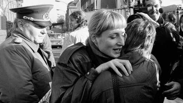 الصورة: مواطنة من ألمانيا الشرقية تحتضن امرأة من الجانب الغربي بعد انهيار السور