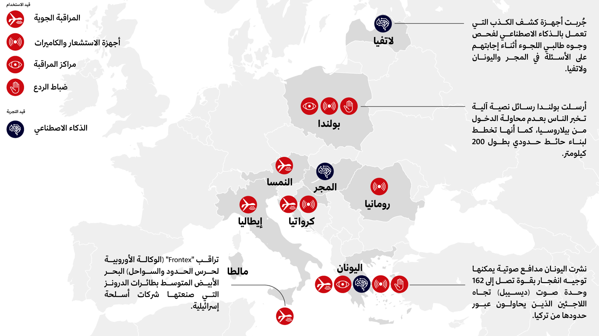 أصبحت حدود بولندا مع بيلاروسيا أحدث خطوط المواجهة لتلك التقنيات، حيث وافقت بولندا الشهر الماضي على بناء جدار بتكلفة 350 مليون يورو مزود بكاميرات متطورة وأجهزة لاستشعار الحركة.