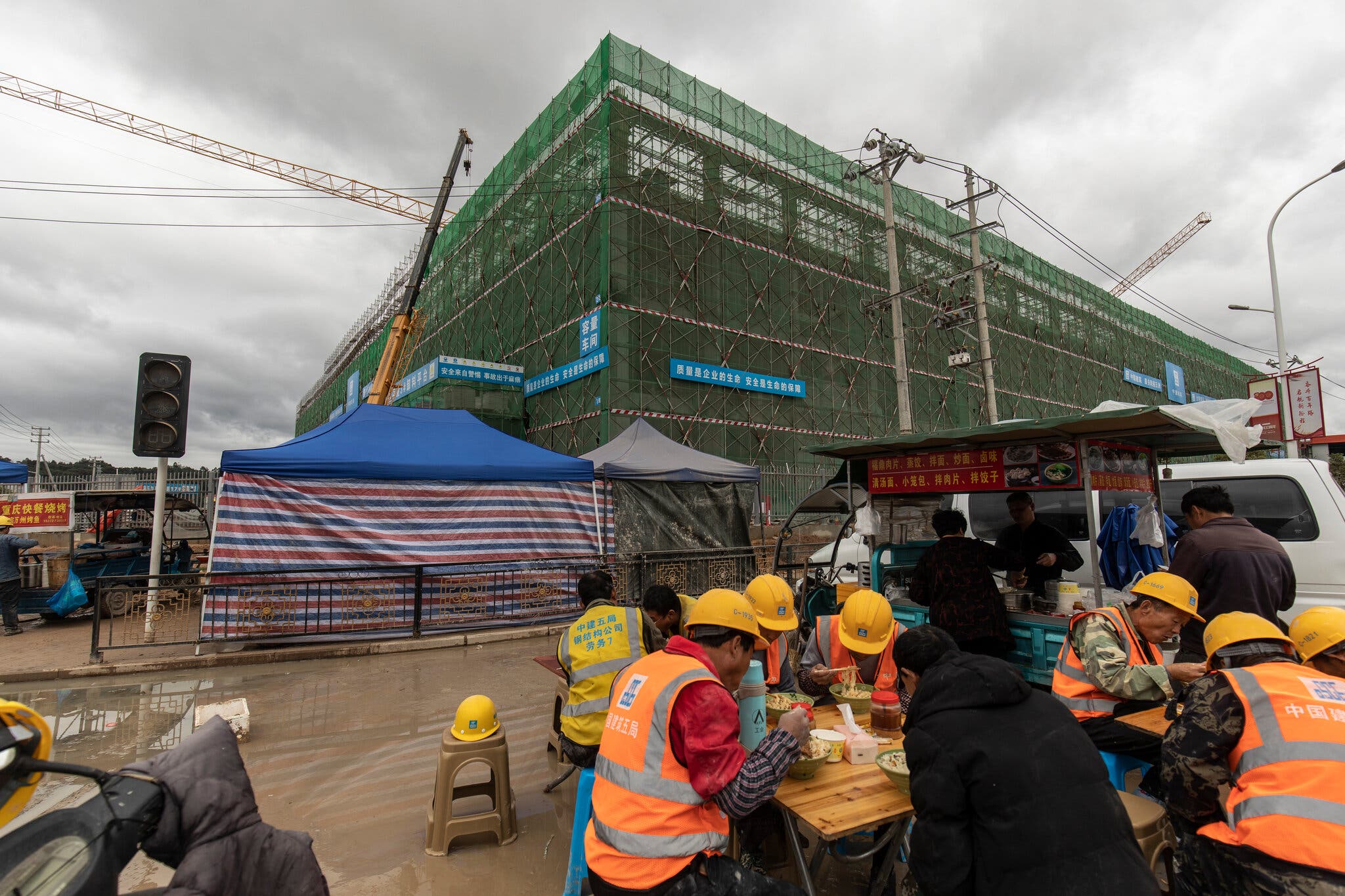 يقول يو بين، أحد العمال في مصنع فودينغ، إنه عمل مؤخرا 20 ساعة متواصلة لإنهاء بناء أحد الأسقف، وأضاف أن “أنوار الرافعات تضيء الليل”.