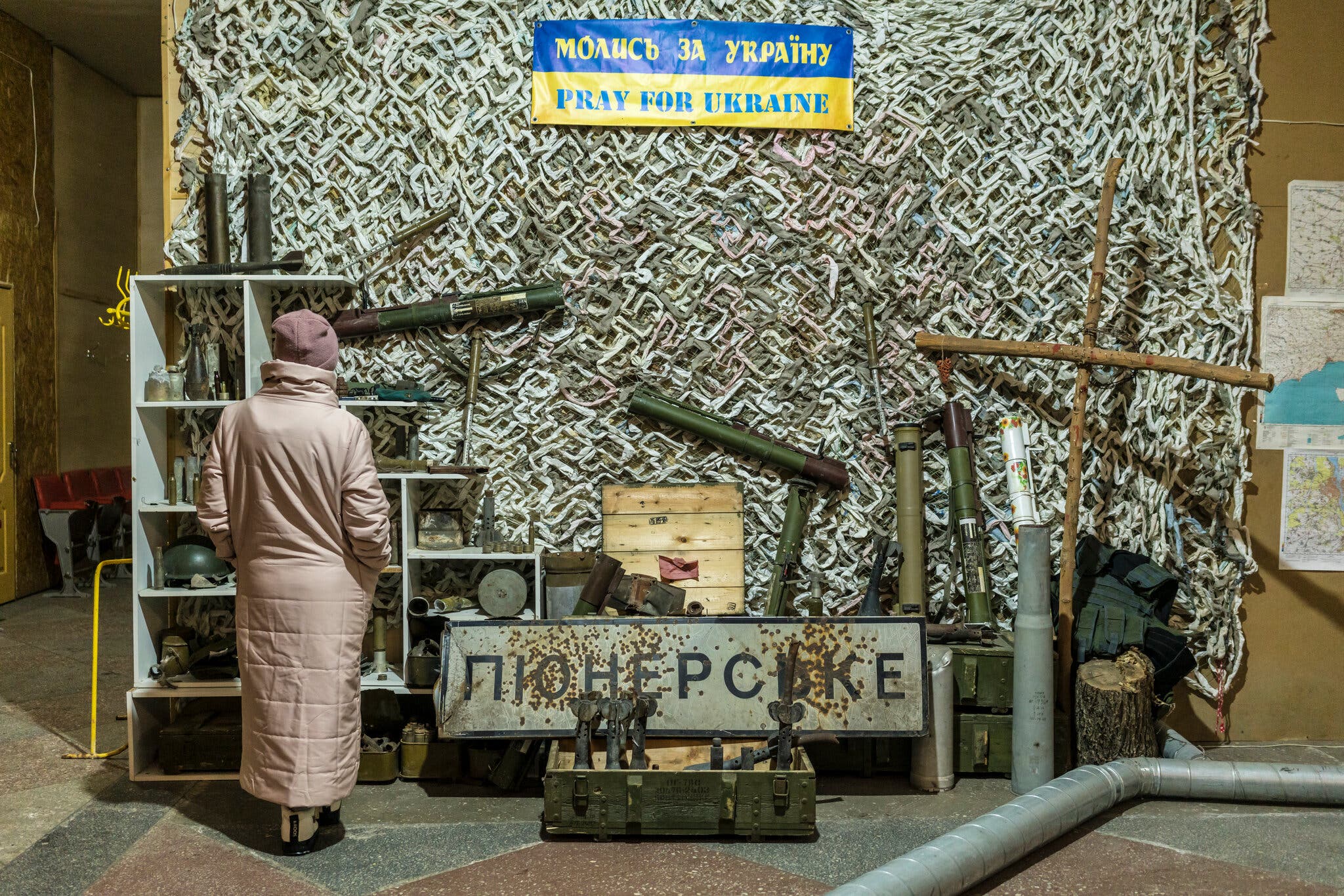 تنظر أوكسانا زافادسكي، وهي واحدة من مؤسسي خدمة الإنقاذ المسيحية للعمليات الخيرية في بيونيرسك، إلى تذكارات الحرب المعروضة في الكنيسة.
