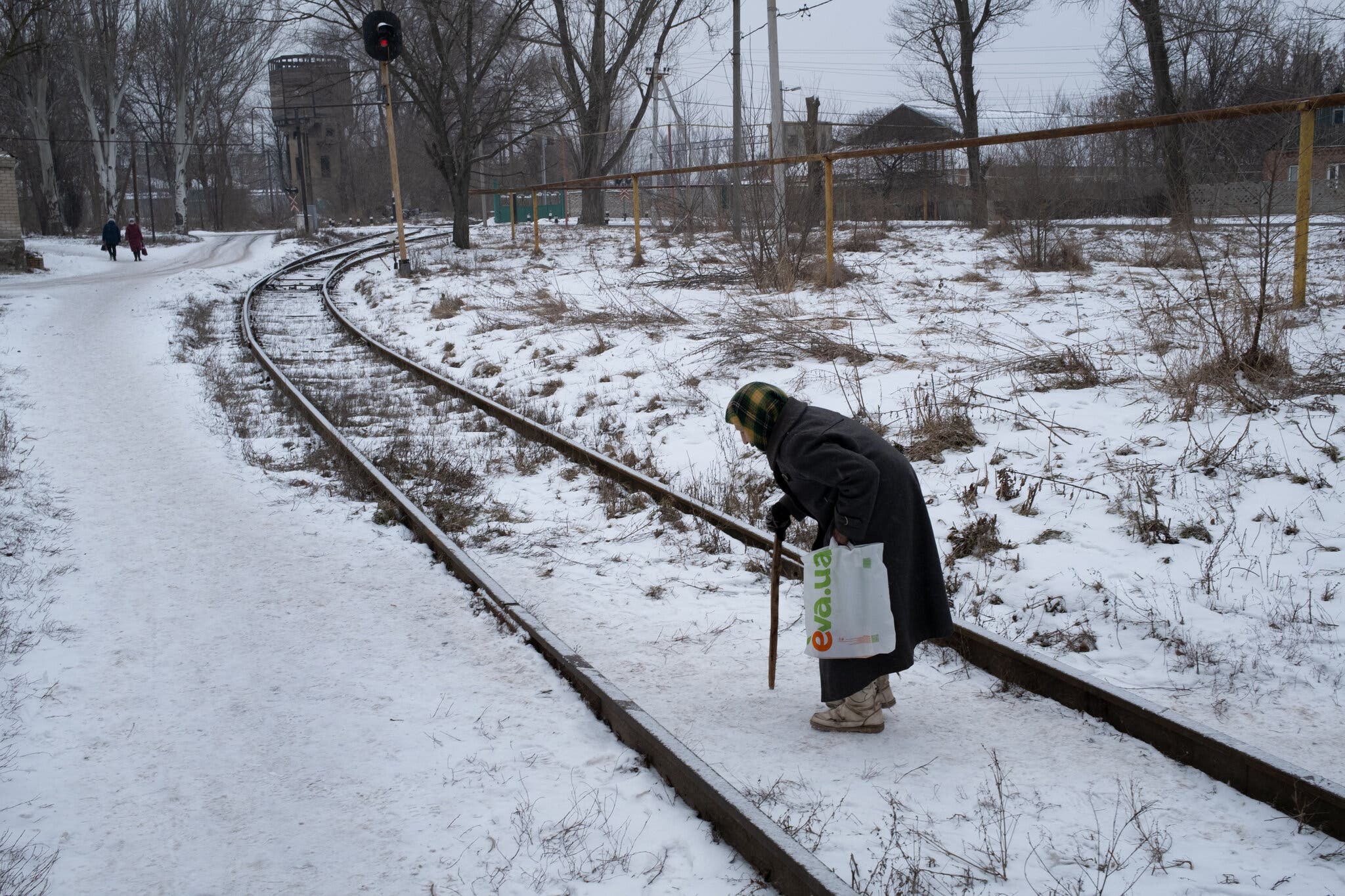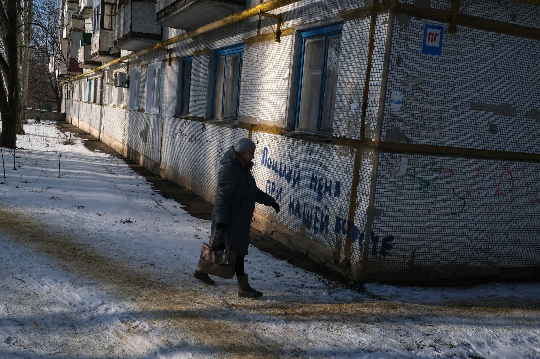 بينما الجنود الأوكرانيون يراقبون وينتظرون في الخنادق الجليدية عند نقطة مراقبة أمامية قريبة، تجر إحدى متساكنات سفيتلودارسك طفلها على الزلاجة عبر الشوارع المغطاة بالثلوج.
