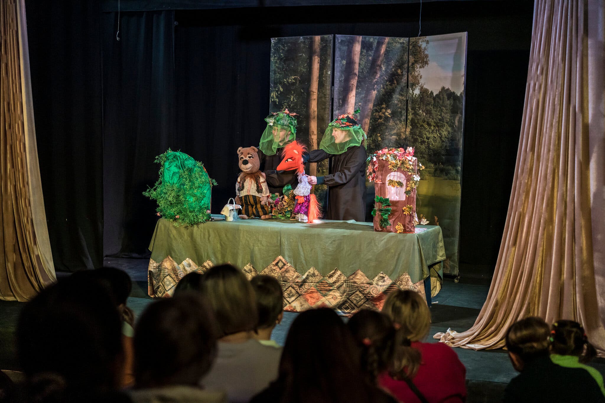 تقدّم سيرهي فاكولا، إلى اليسار، وماريا بويكو عرض “الثعلب والدب” في مسرح ماريوبول للدمى.