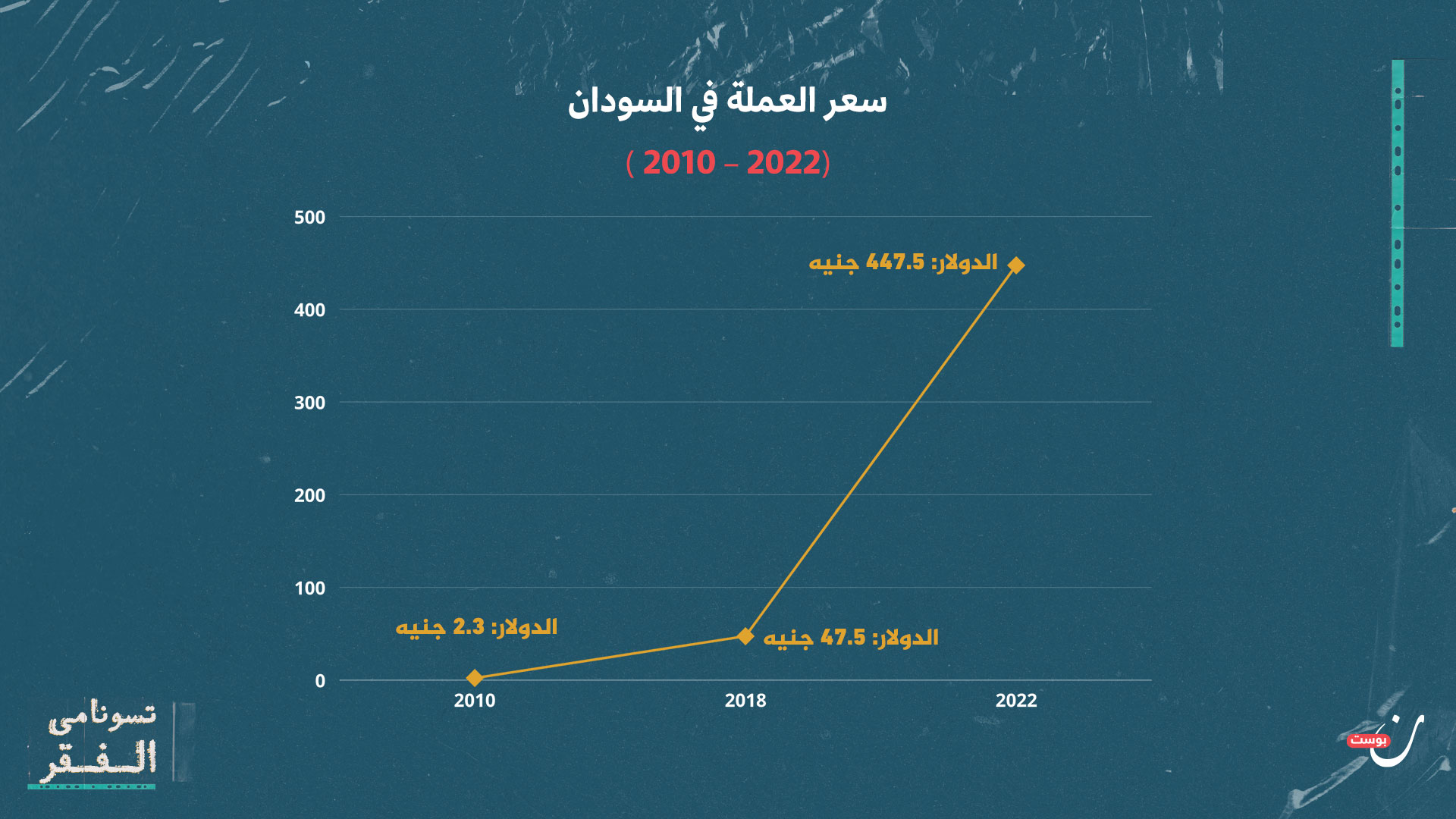 تمتلك السودان ثروات وموارد طبيعية كفيلة أن تضعها على قوائم الدول الأكثر ثراءً في القارة الإفريقية، إلا أن الفقر يسير بخطوات متسارعة داخل الشارع السوداني، إذ بات قرابة 80% من السودانيين فقراء، إثر انهيار العملة المحلية أمام الدولار الأمريكي حتى وصل سعر الدولار الواحد إلى 447.5 جنيه سوداني بعدما كان يساوي 2.3 جنيه في 2010 و47.5 جنيه في 2018.