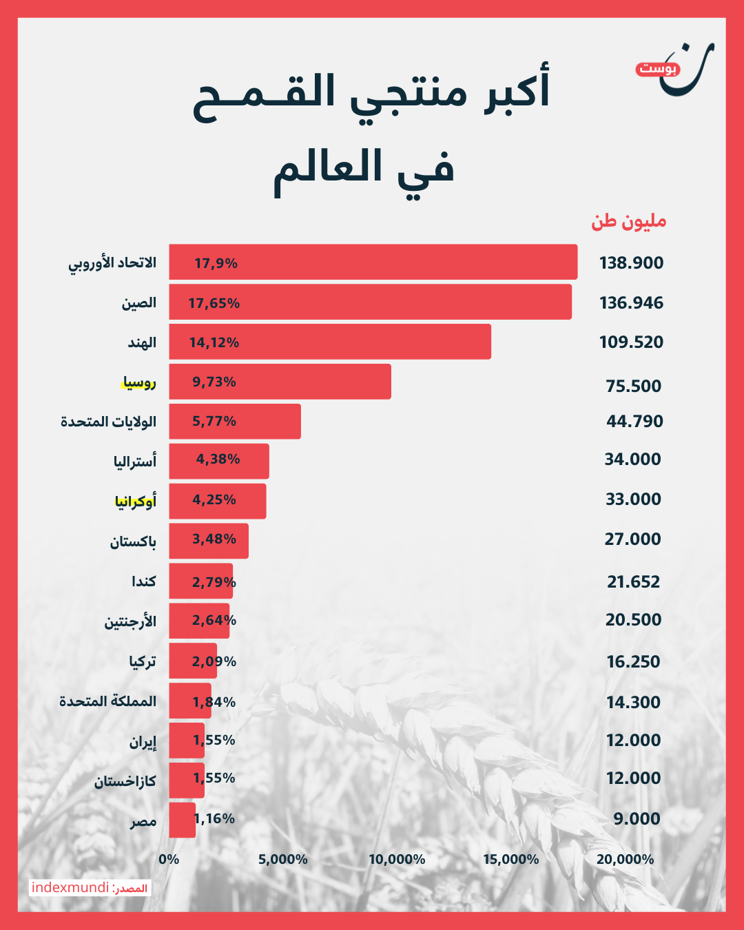 لقد أدرك الكثير من الناس أن روسيا وأوكرانيا لاعبان أساسيان في سوق السلع الزراعية العالمية، حيث تنتج روسيا حوالي 10% من القمح العالمي بينما تنتج أوكرانيا 4%، ويعادل هذا تقريبًا حجم إجمالي إنتاج القمح في الاتحاد الأوروبي، ويمثل البَلدان معًا ربع صادرات القمح العالمية.