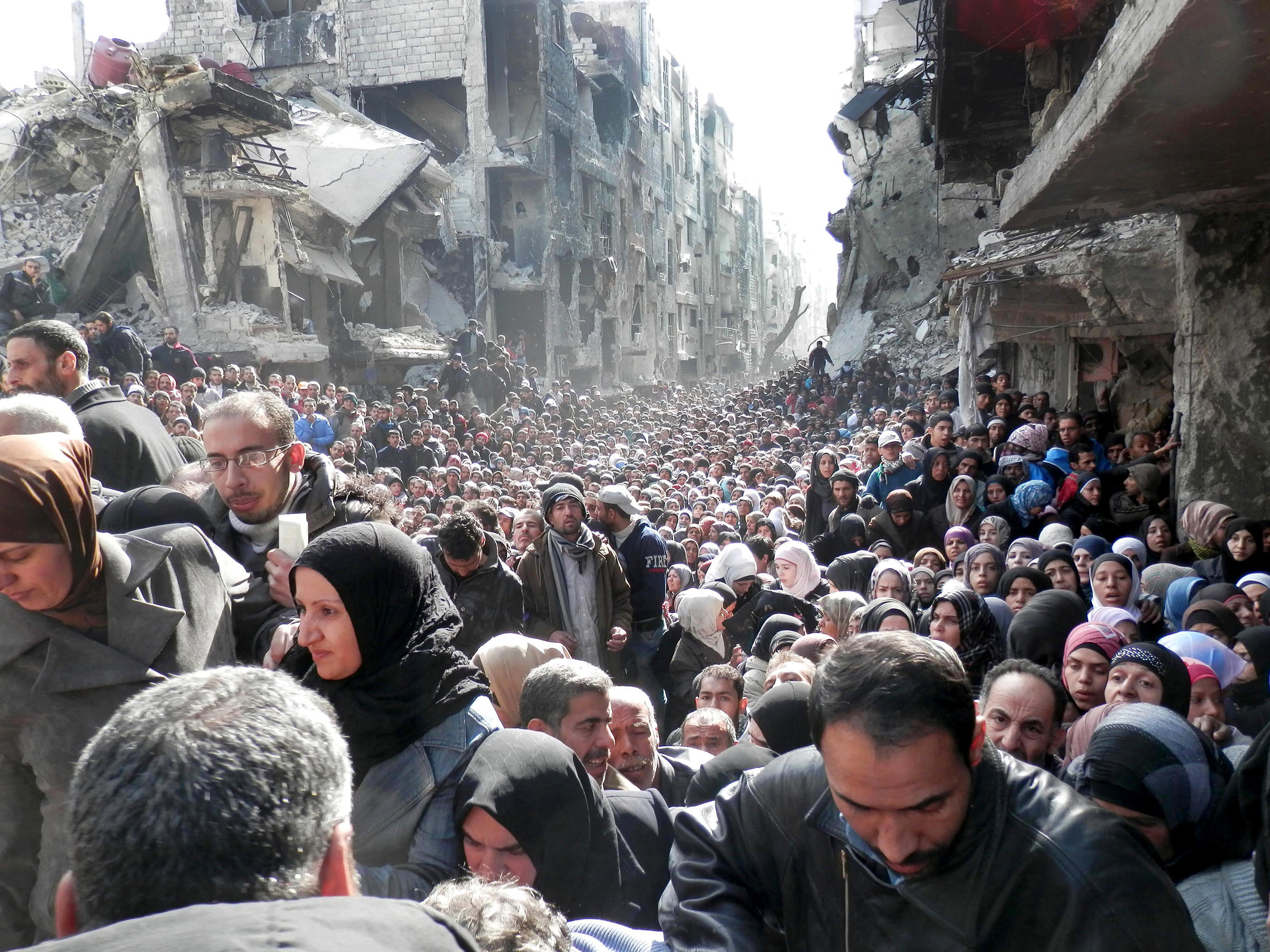 في فبراير/ شباط 2014 نُشرت صور لمخيم اليرموك وأذهلت الرأي العام العربي والعالمي في مشهد غير اعتيادي، إذ تحوّل المخيم إلى ساحة معركة سعيًا وراء الرغيف، حيث تبارى المحاصرون للحصول على المساعدات القليلة التي وصلت إلى مخيمهم، وكان نظام الأسد قد ضرب حصارًا كبيرًا على المناطق الجنوبية في العاصمة دمشق أبرزها مخيم اليرموك.