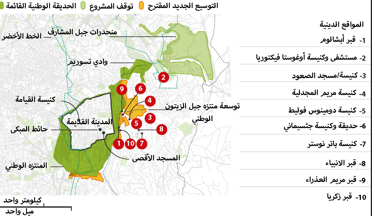 تبدو الحديقة الوطنية في ظاهرها وكأنها استغلال جدير بالاهتمام للمساحة والتمويل. وفي شباط/ فبراير من السنة الماضية، ذكرت صحيفة “تايمز أوف إسرائيل” أن اقتراحًا بتوسيع حدود حديقة أسوار القدس الوطنية الحالية لتشمل مساحة شاسعة من جبل الزيتون قد تم إعداده للحصول على موافقة مبدئية من قبل لجنة التخطيط في البلدية.