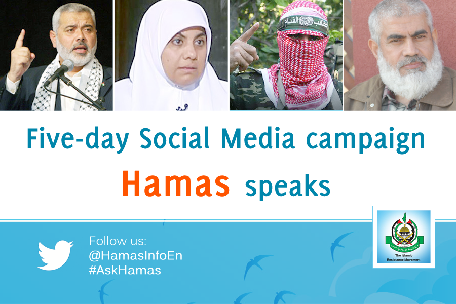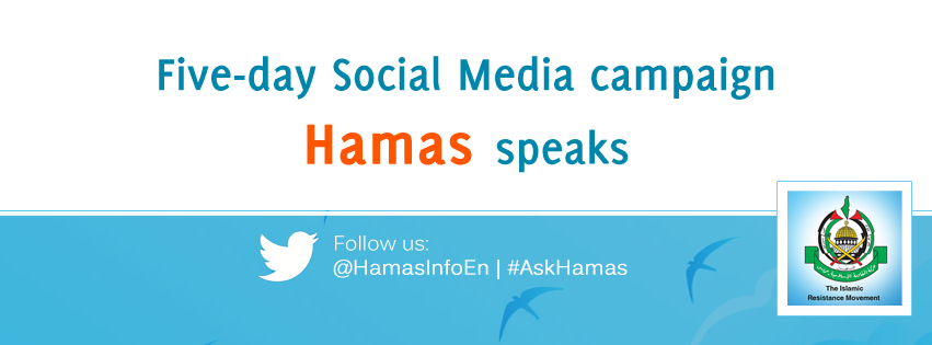 لأول مرة في تاريخ المقاومة الفلسطينية أطلقت حركة المقاومة الإسلامية حماس حملة للتغريد على مواقع التواصل الاجتماعي تحت وسم #AskHamas لمدة خمسة أيام تتحدث فيها عن فلسفتها ومنهجها، وتدعو العالم الغربي أن يوجه لها الأسئلة ويسمع منها لا أن يسمع عنها.