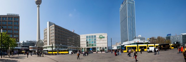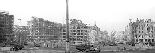 ألِكساندربلاتز، إحدى المناطق المركزية للحياة والثقافة في برلين، ومعقل الملاهي الليلية في فترة العشرينيات، تم تدميرها تمامًا في الحرب، وأعيد بنائها في الستينيات لتكون قلب برلين الشرقية ببرج التلفاز الذي اشتهرت به إلى اليسار.