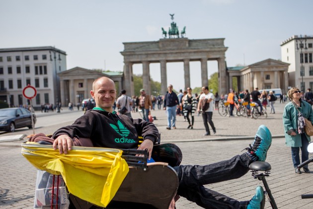 في الصورة الأولى إلى اليمين يقف الشاعر والمراسل فاسيلي زاخارتشينكو في حوار مع جندي سوفيتي، في 16 مايو 1945، بينما يجلس كليمنس، سائق الريكشو (عربة تجرها عجلة)، في نفس الموقع في 24 أبريل 2015، في انتظار زبون آخر، وفي الخلفية يقف فندق أدلون الذي تم تدميره أيضًا في الحرب، عام 1945، ليُعاد بناؤه عام 1997.