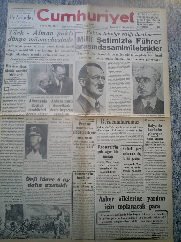 صحيفة جمهوريت المحسوبة على النظام التركي عام 1941 بعد توقيع ميثاق الصداقة بين تركيا وألمانيا في إطار الحياد التركي آنذاك