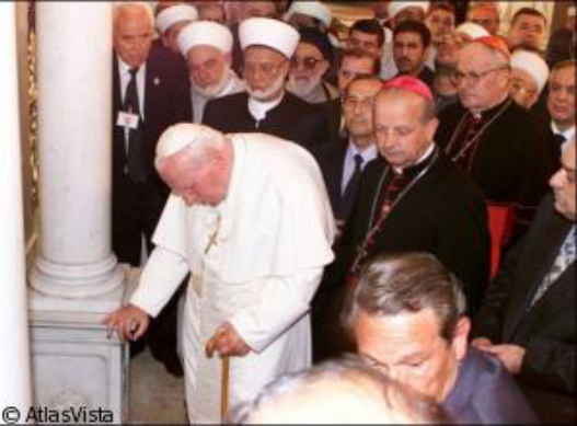 البابا يوحنا بولس الثاني في الجامع الأموي في دمشق، في 6 مايو 2001، وهو أول بابا يتلو الصلوات في مكان عبادة مسلمين.