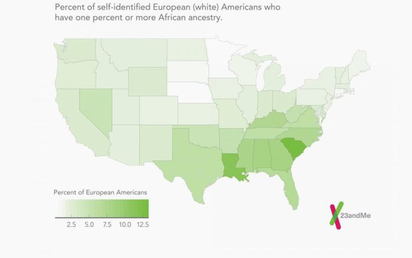 وفقًا لدراسة نُشرت في عام 2014 في المجلة الأمريكية لعلم الوراثة البشرية، يعيش معظم الأمريكيين الذين يُعرفون عن أنفسهم بأنهم بيض، ويحملون أصولًا أفريقية مخفية، في جنوب وجنوب شرق البلاد: