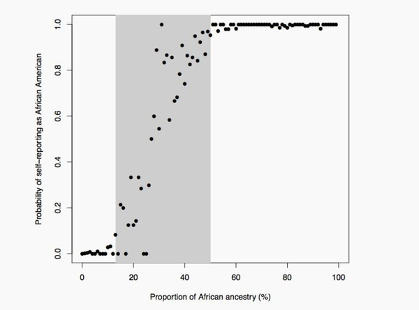 في الرسم البياني محور الـX الأفقي يبين نسبة السلف الأفريقي لدى الأمريكيين، ومحور الـY العمودي يبين احتمالية تعريف هؤلاء عن أنفسهم بأنهم أمريكيين أفارقة.