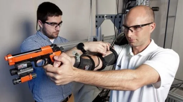 يتكون جهاز الذراع هذا من هيكل كربوني يتم لفه حول الذراع، مع كابلات ضغط مدمجة، محركات كهربية، بطارية، ومستشعرات موصولة بها، وعندما تمتد الذراع للتصويب، تلتقط المجسات أي رعشة صغيرة، فتقوم المحركات بشد الكابلات المناسبة كي توقف هذه الحركة بشكل أوتوماتيكي، فتصبح الرصاصة في النهاية أكثر دقة.