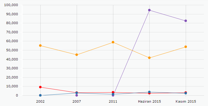 في إزمير، المطلة على بحر إيجة والمنقسمة لمنطقتين انتخابيتين كبيرتين، وهي واحدة من معاقل العلمانيين التقليدية، خرج حزب الشعب الجمهوري فائزًا كعادته بل وزاد رصيده بـ60 ألف صوت، غير أن العدالة والتنمية، والذي حل ثانيًا، قد رفع أصواته بـ150 ألفًا، بينما خسر القوميون 50 ألفًا، والأكراد حوالي 35 ألفًا، لتؤكد النتائج مرة أخرى أن خسائر الحزبين ليست كافية لشرح صعود العدالة والتنمية، خاصة بالنظر لزيادة أعداد المصوتين في المدينة بحوالي مائة ألف صوت، والتي ذهب معظمها على الأرجح للعدالة والتنمية، مع غالبية أصوات القوميين ممن كانت أصلًا جزءًا من قاعدته الانتخابية في 2011 قبل أن تتجه للقوميين في يونيو الماضي، في حين يبدو أن غالبية الأكراد ممن تركوا حزب الشعوب قد اختاروا حزب الشعب، كما يشير الرسم البياني أعلاه لانتخابات المنطقة الثانية في إزمير.
