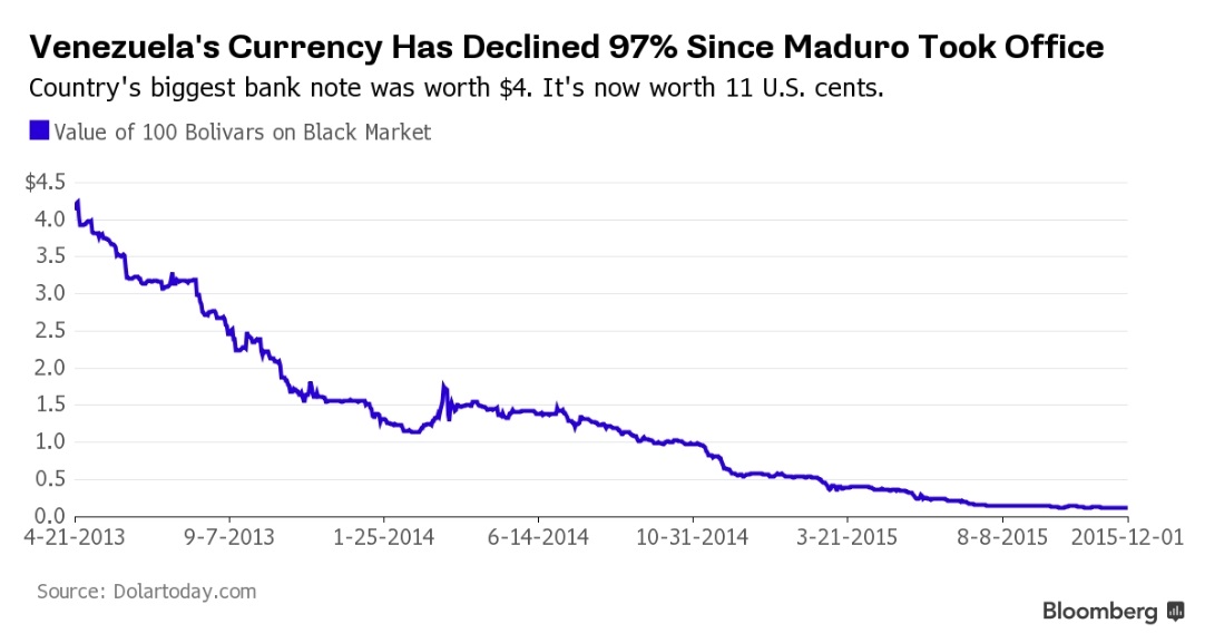 في الرسم البياني الموضح أدناه يُظهر هبوط البوليفار بمقدار 97% منذ استلام مادورو رئاسة البلاد، حيث يظهر الاتجاه المنحدر لورقة نقدية (bank note) تعود لأكبر بنك في البلاد كانت تساوي 4 دولار أمريكي تساوي اليوم 11 سنتًا أمريكيًا.