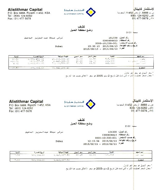 ووفقًا للموقع بلغت قيمة الاستثمار لدى الدخيل نحو 8.4 ملايين ريال سعودي، والوثيقة الثانية هي محفظة استثمارية أخرى في “الاستثمار كابيتال” أيضًا بتاريخ 13 من أغسطس 2015، والتي تبين أن قيمة استثمارات الدخيل ارتفعت إلى ما يقرب من 94 مليون ريال سعودي، أي أكثر من 11 ضعفًا عما كانت عليه في وقت سابق من 6 أشهر فقط.